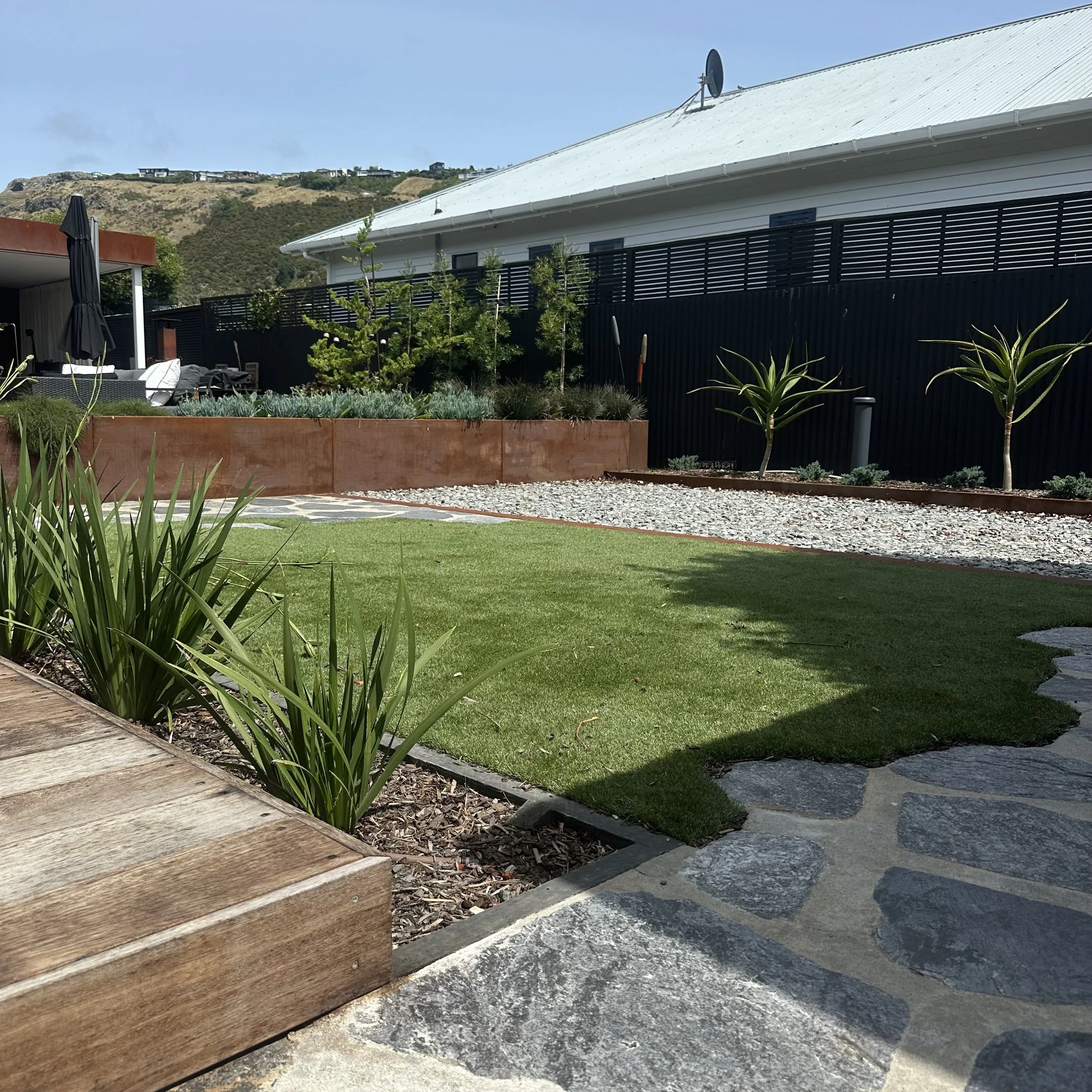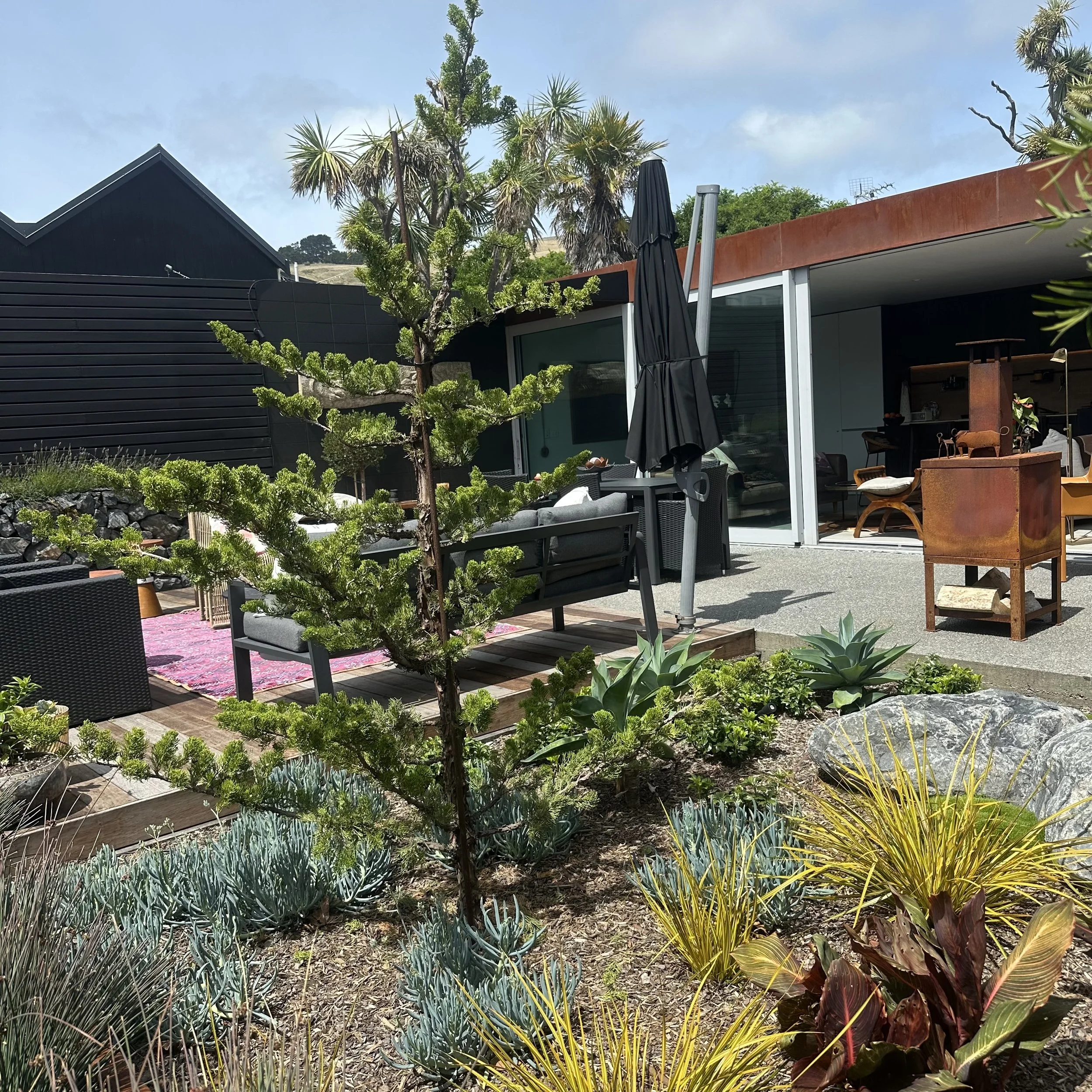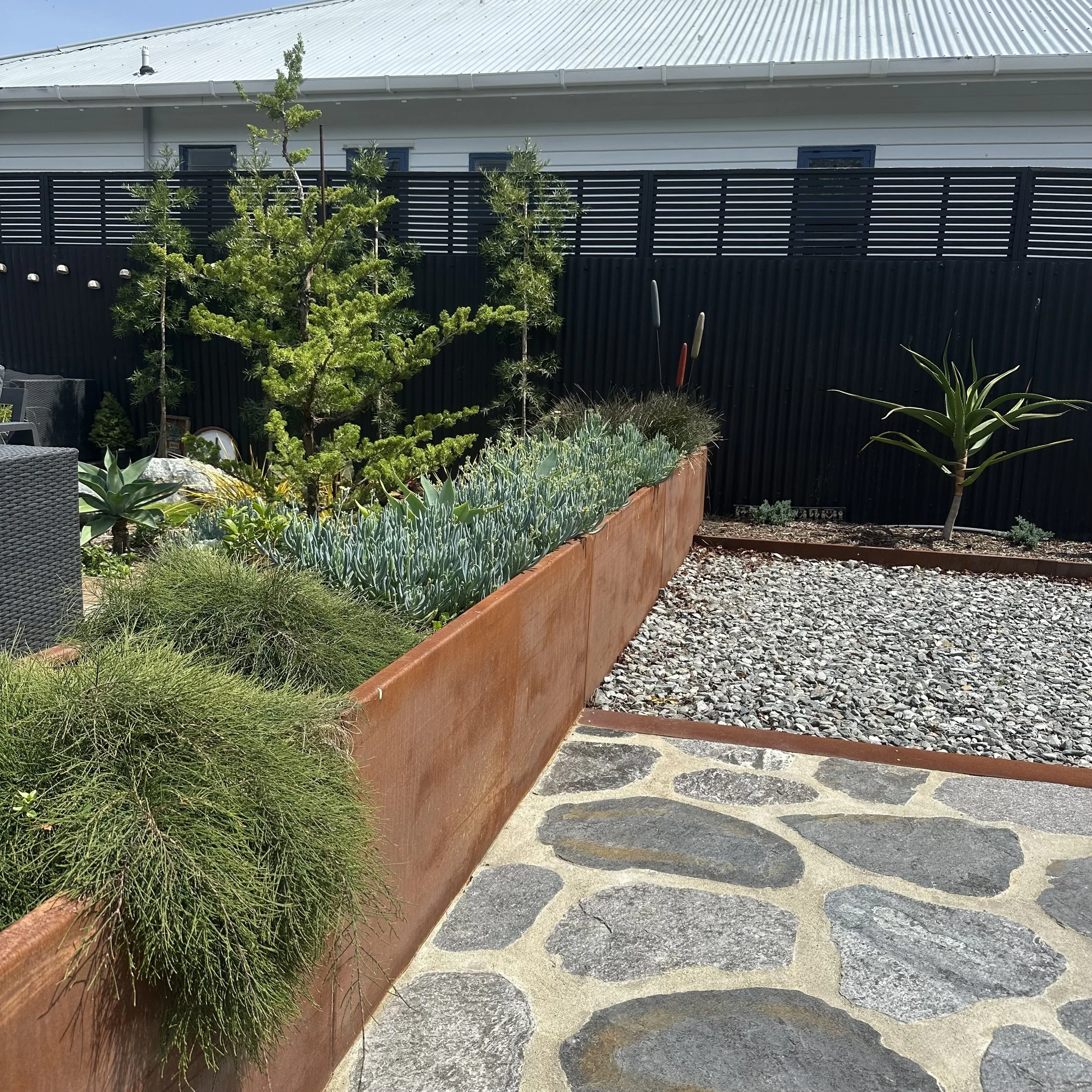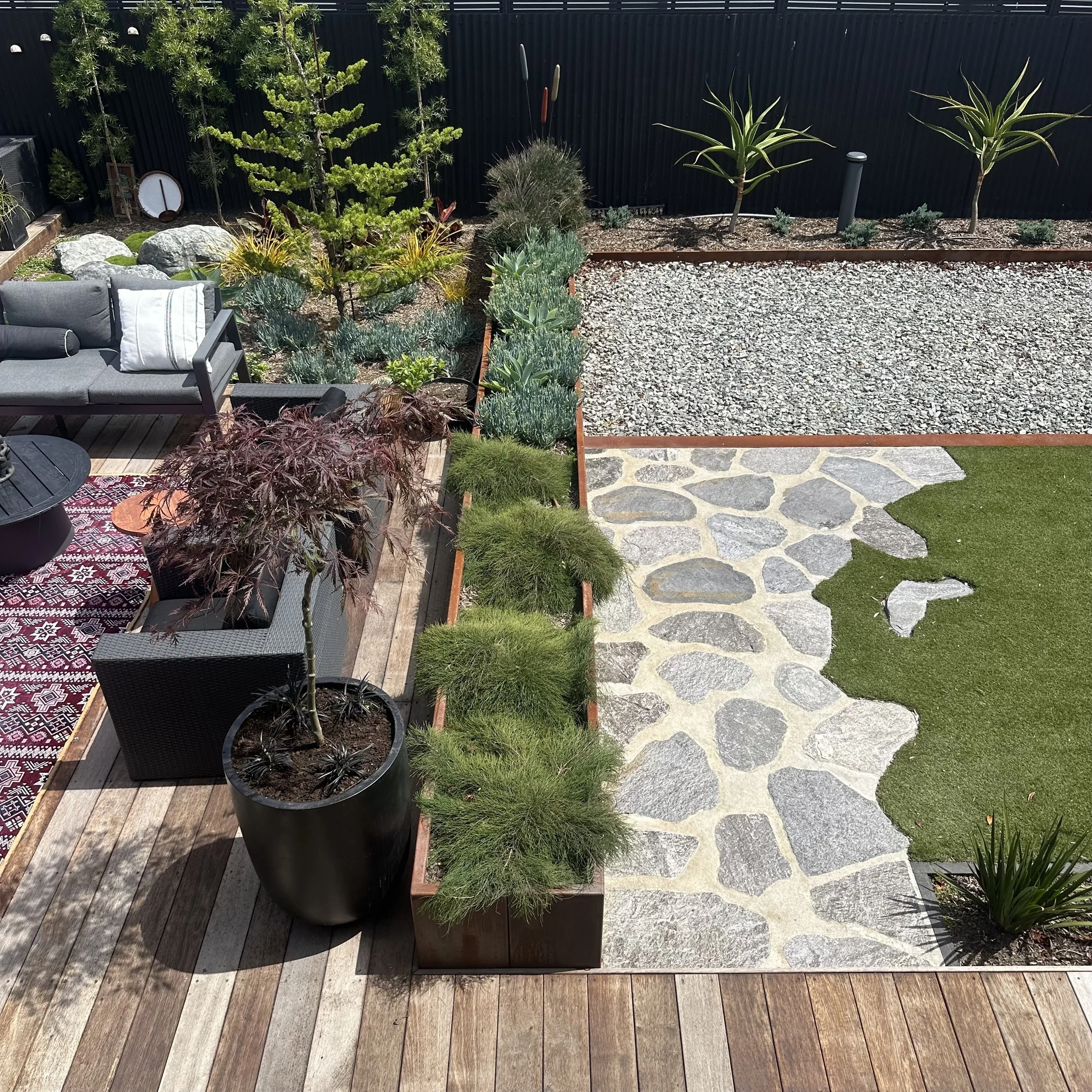 The brief was simple: elevate the landscaping to match the beautifully considered ‘tiny home’. The result is a contemporary courtyard garden that balances industrial materials with Japandi restraint and Mediterranean influences. Raw, honest materials- steel, stone and hardwood- define clean lines and purposeful zones, while a restrained planting palette prioritises form, texture, and structure. The outcome is a cohesive and refined outdoor space.