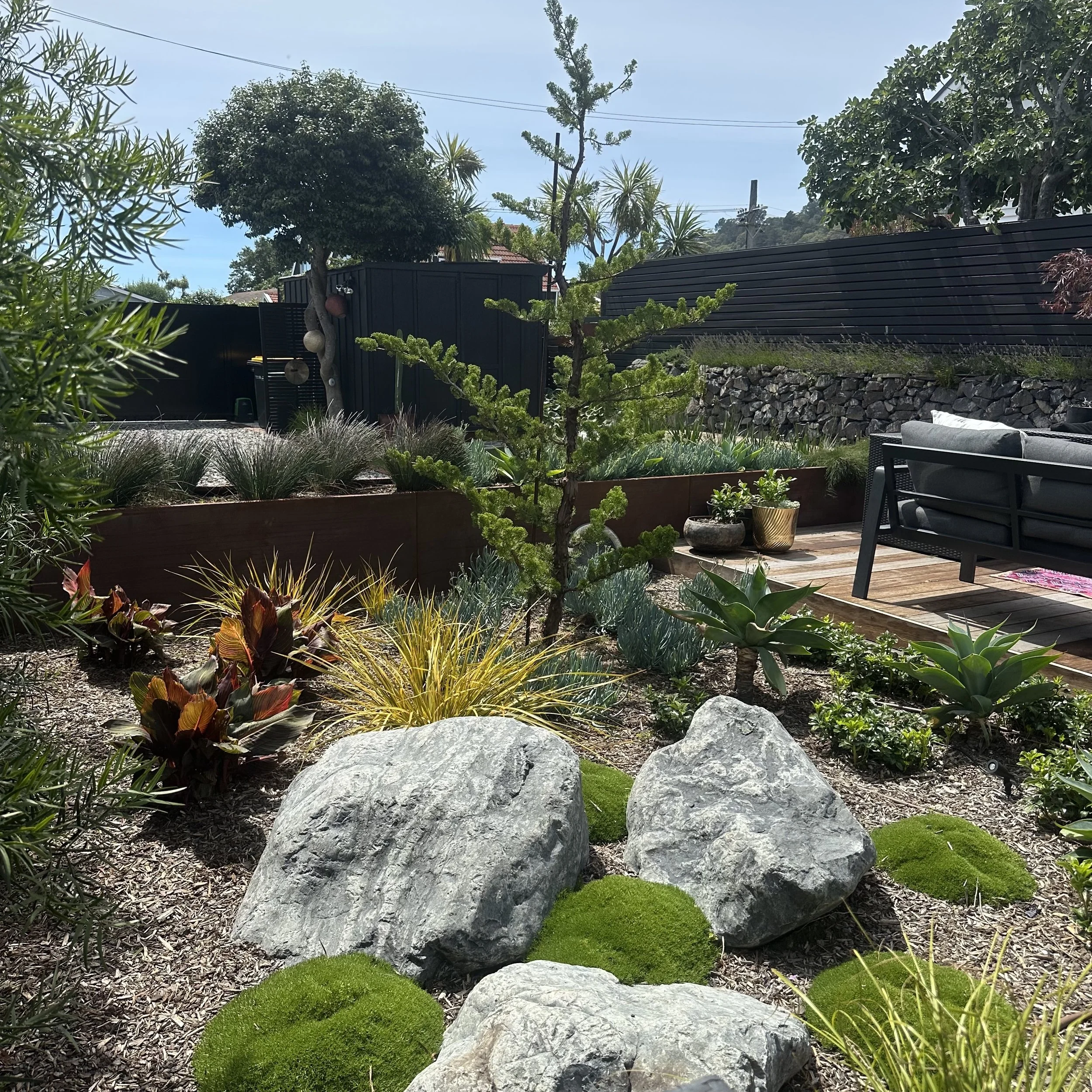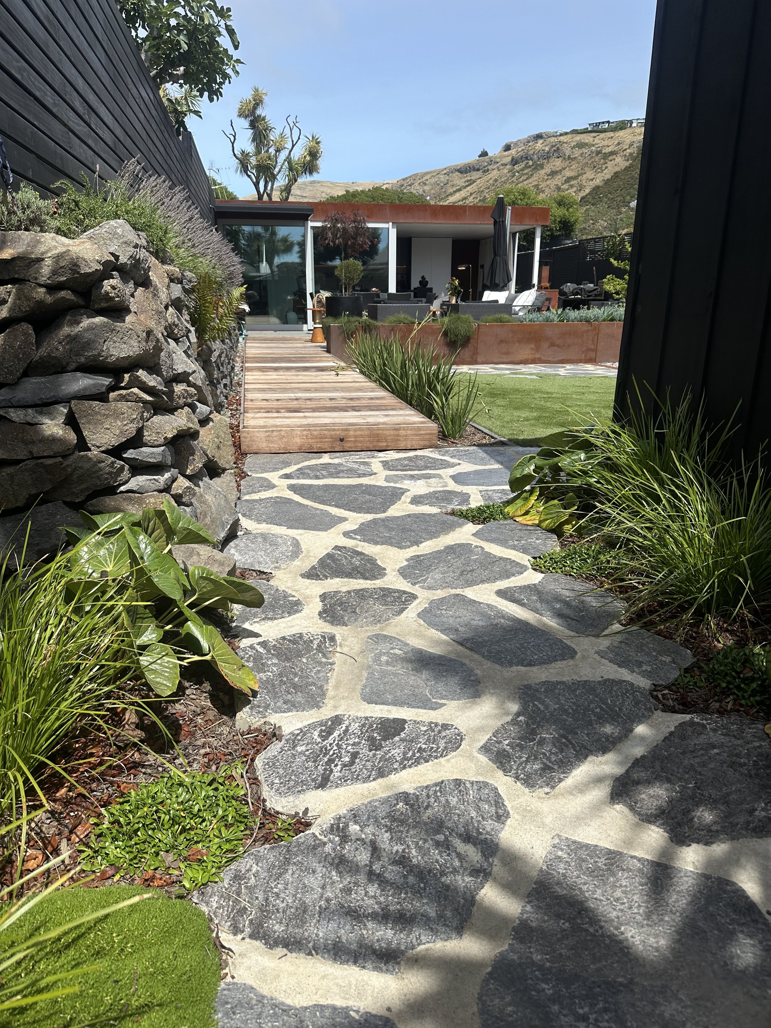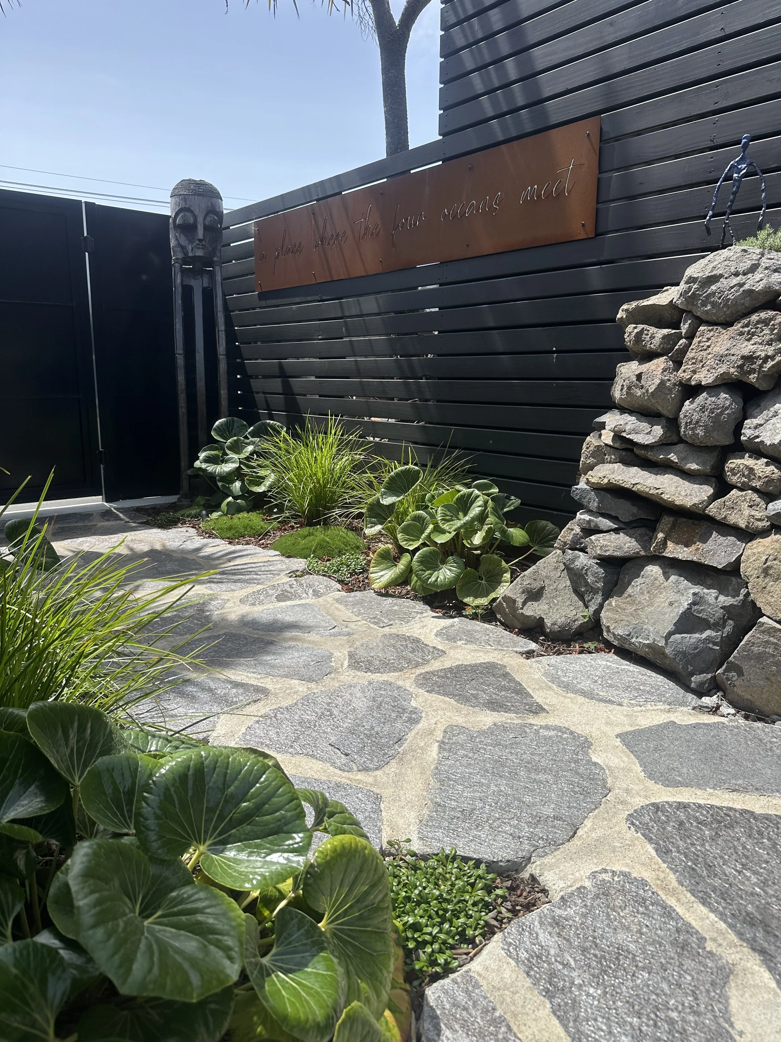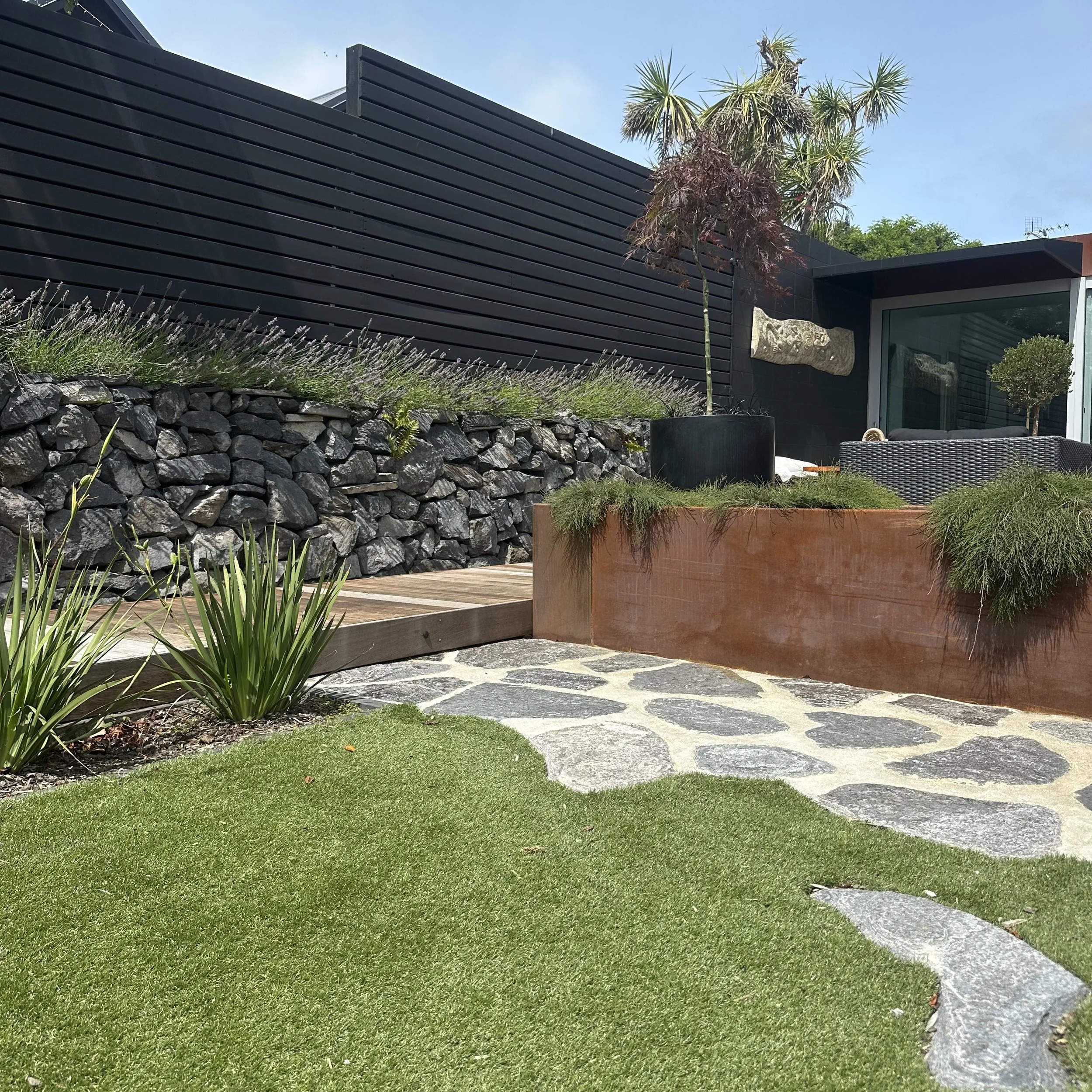 The brief was simple: elevate the landscaping to match the beautifully considered ‘tiny home’. The result is a contemporary courtyard garden that balances industrial materials with Japandi restraint and Mediterranean influences. Raw, honest materials- steel, stone and hardwood- define clean lines and purposeful zones, while a restrained planting palette prioritises form, texture, and structure. The outcome is a cohesive and refined outdoor space.